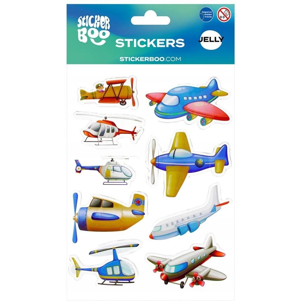 Żelowe naklejki STICKER BOO z grafiką w Samoloty z pewnością przypadną do gustu dzieciakom, idealne do zdobienia rysunków, wszelkiego rodzaju prac plastycznych oraz kolekcjonowania.Na blisterku znajduję się 9 szt. naklejek.