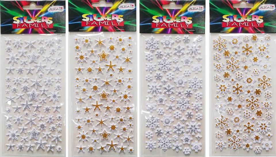 - stylowe naklejki w kształcie gwiazdek i śnieżynek w kolorze złotym i srebrnym to doskonały sposób, aby dodać Twoim dekoracjom blasku i świątecznej elegancji,