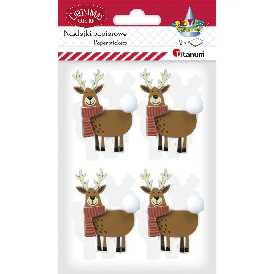 Naklejki papierowe 3D z pomponem. Kształty: renifery w szaliku, kolor: mix, wymiary renifera: 42 x 57 mm. 2 plansze - 8 szt.