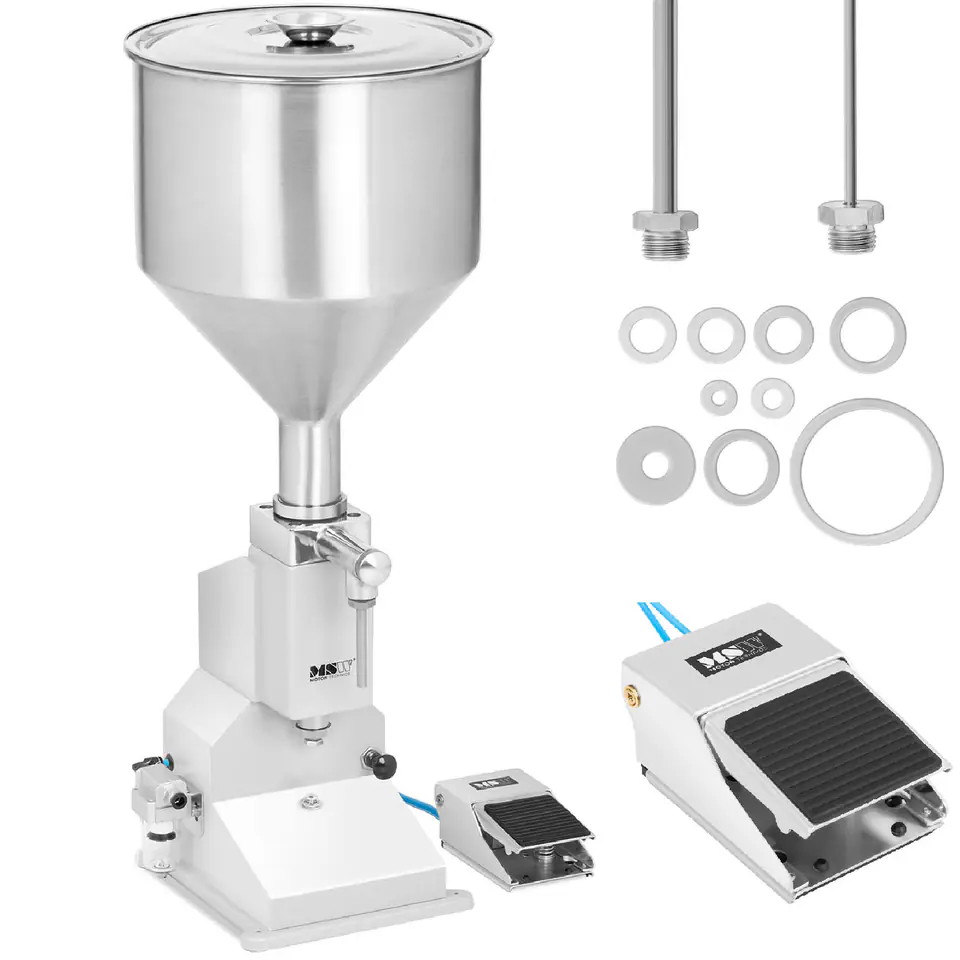 Kod producenta: 10061276Nalewarka do płynów marki MSW świetnie sprawdzi się w wielu branżach, w których napełnianie butelek i innych naczyń to codzienność. Maszynę wykorzystasz do dozowania płynów bez elementów stałych np. napojów, alkoholi, olejów, kremów do ciała, szamponów, syropów itd. Nalewarkę do płynów wyposażono w zbiornik o pojemności 10,6 l oraz otwór dozujący Ø8 mm, który można zmniejszyć do Ø4 mm. Funkcja regulacji pozwala dostosować zakres nalewania 5-50 ml oraz ustawienie prędkości od 8 do 43 razy na minutę. Parametry zmienisz za pomocą pokręteł. Maksymalna dokładność dozowania wynosi 1%. Nalewarka jest wyposażona w zasilanie pneumatyczne.Cechy produktu: