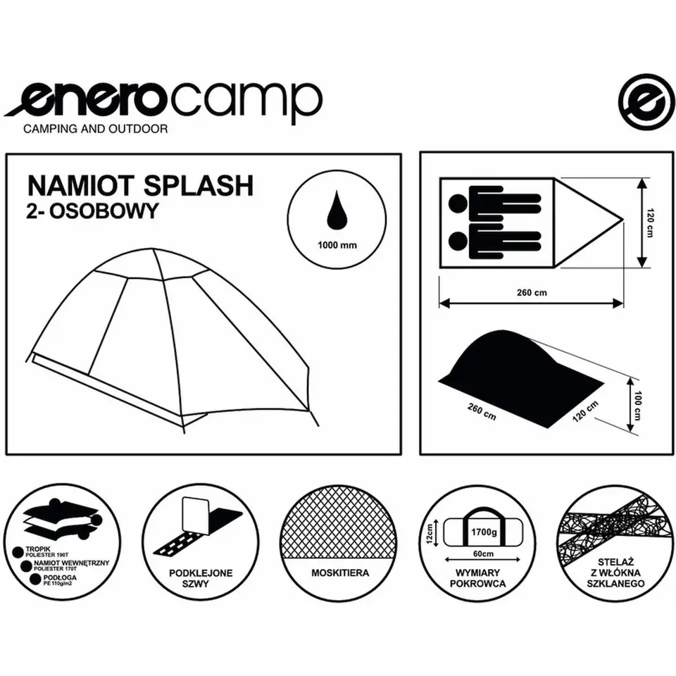 - Wymiary zew. ok.: 120 x 260 x 100 cm (szer. x dł. x wys.)Wymiary wew. rozłożonego namiotu ok.: 115 x 200 x 95 cm (szer. x dł. x wys.)Wysokość rozłożonego namiotu: 95 cmWymiary wejścia: 85 x 70 cm (szer. x wys.)Wymiar opakowania (pokrowiec z uchwytem): 60 x 12 cm (dł. x śr.)Materiał tropiku: poliester 190TMateriał namiotu: poliester 170TMateriał podłogi: PE 110g/m2Stelaż: włókno szklaneWodoodporność na poziomie 1000 mm słupa wodyDodatkowe wyposażenie: wewnętrzna kieszonkaZamek dwukierunkowy, dwustronnyMożliwość zwinięcia wejścia: takWaga netto: 1,570 kgLiczba miejsc: maks. 2 os.Przeznaczenie: kemping, biwak, koncertW zestawie: namiot, pokrowiec, instrukcja obsługi, śledzie 9 szt., linki do naciąguMarka: Enero Camp