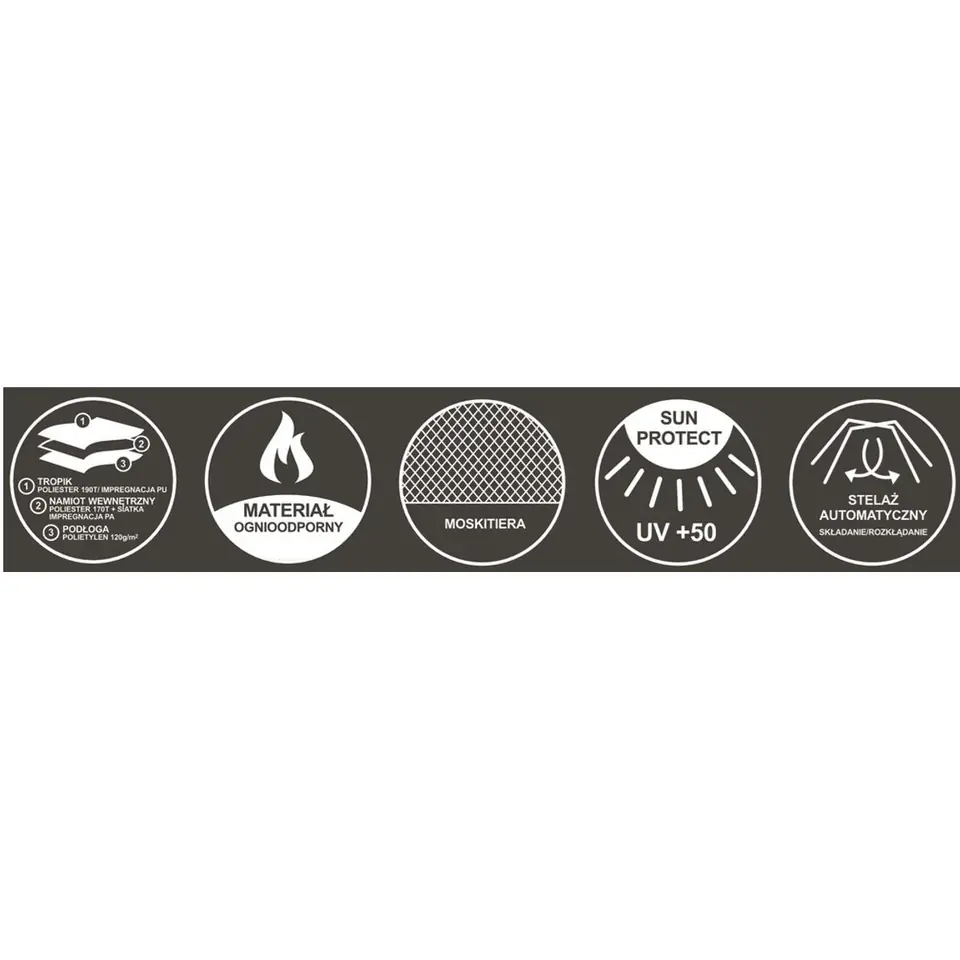 - idealny dla 3 osóblekki i niewielkich rozmiarówspakowany w poręczny pokrowiecwyposażony w dwa wejścia zamykane na dwustronny zamekz automatycznie rozkładanym stelażem w systemie pop upz ognioodpornego materiału i wodoodporności 2000mmmoskitiera zapewni wentylacje powietrza i ochroni przed owadamifunkcja 2 w1 pozwoli na oddzielenie tropiku od namiotu i korzystanie z niego np. jako namiot plażowyspecjalny haczyk na suficie namiotu pozwoli zawiesić małą latarkę lub lekką lampkę turystyczną