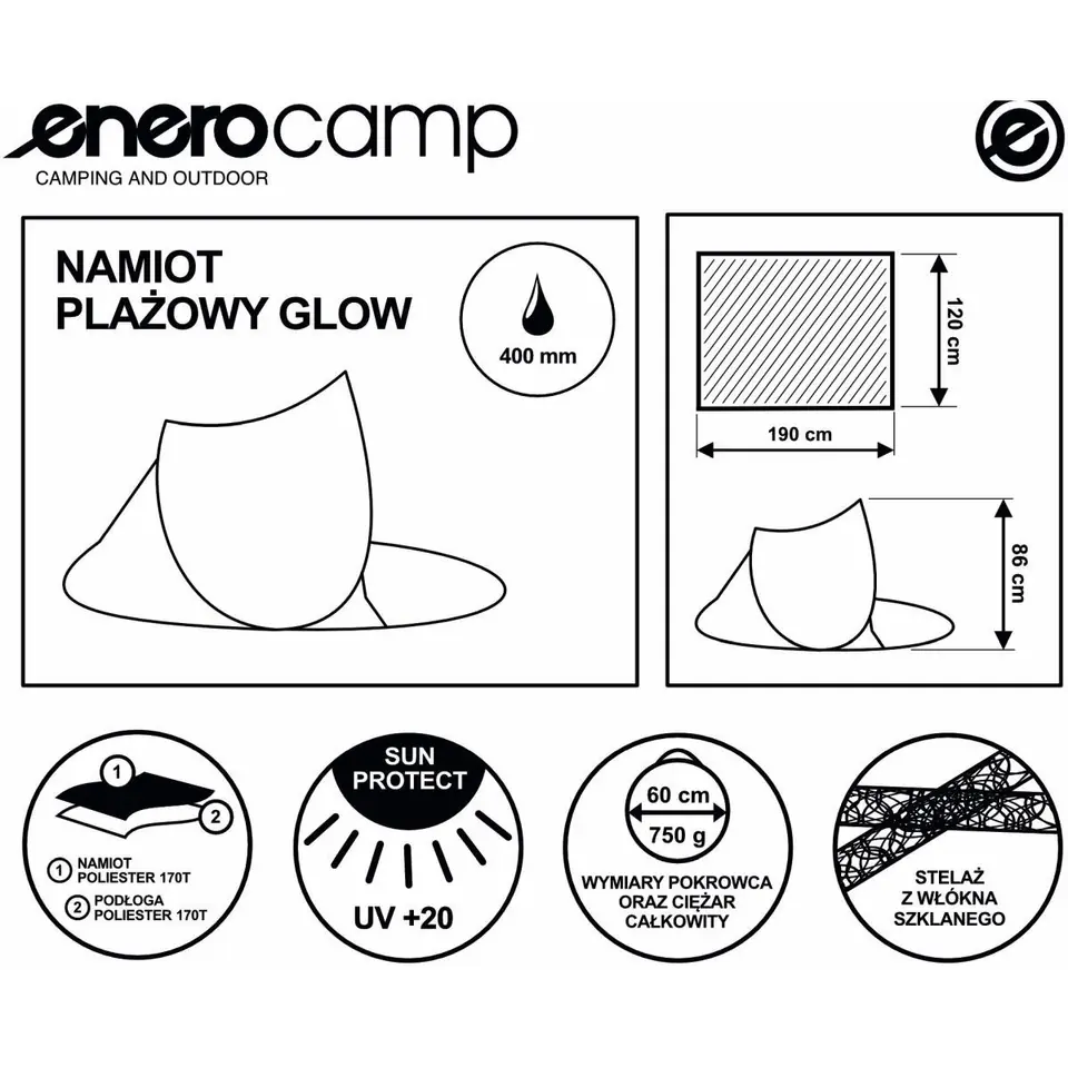 Parametry:- Wymiary wew. rozłożonego namiotu ok.: 188 x 118 x 88 cm (dł. x szer. x wys.)Wymiary zew. rozłożonego namiotu ok.: 190 x 120 x 90 cm (dł. x szer. x wys.maks.)Materiał namiotu: poliester 170TMateriał podłogi: poliester 170TMateriał stelaża: włókno szklane ok. 5 mmOchrona UV: tak +20Samorozkładana konstrukcja: takWstawki z siatki zapewniają wentylację: takW zestawie śledzie: tak, 5 szt.Linka napinająca: tak, 2 szt.Pakowany w pokrowiec: tak, z poręcznymi rączkamiWymiary pokrowca ok: 60 x 3 cm (śr. x gr.)Waga netto: 0,660 kgWaga brutto (w pokrowcu): 0,770 kgW zestawie: osłona plażowa, pokrowiec, instrukcja obsługi, naciągi, śledzieMarka: Enero Camp