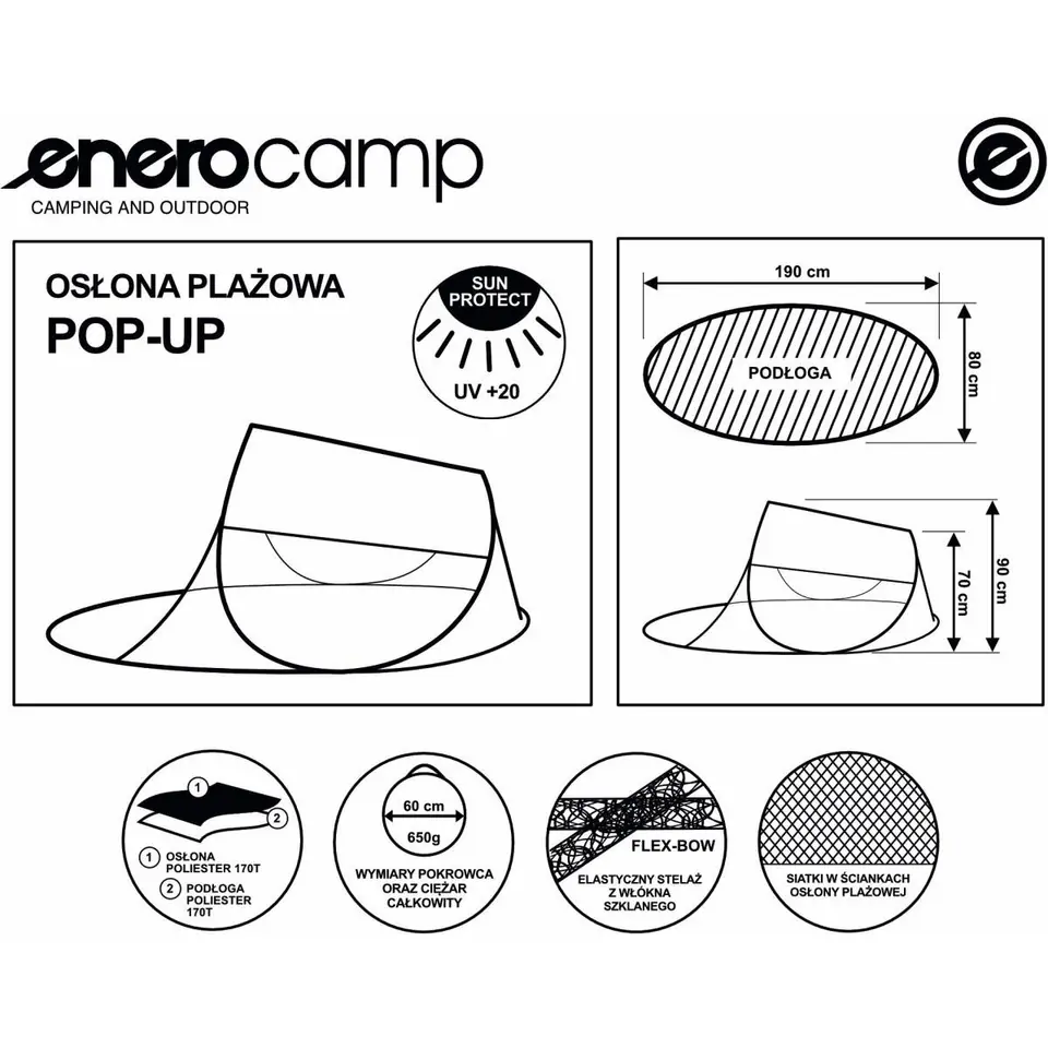 Parametry:- Wymiary wew. rozłożonego namiotu ok.: 188 x 78 x 88 cm (dł. x szer. x wys.)Wymiary zew. rozłożonego namiotu ok.: 190 x 80 x 90 cm (dł. x szer. x wys.maks.)Materiał namiotu: poliester 170TMateriał podłogi: poliester 170TMateriał stelaża: włókno szklane ok. 3 mmOchrona UV: +20Samorozkładana konstrukcja: takWstawki z siatki zapewniają wentylację: takW zestawie śledzie: tak, 5 szt.Linka napinająca: tak, 2 szt.Pakowany w pokrowiec: tak, z poręcznymi rączkamiWymiary pokrowca: 60 x 3 cm (śr. x gr.)Waga netto ok.: 0,46 kgWaga brutto (w pokrowcu) ok.: 0,5 kgW zestawie: osłona plażowa, pokrowiec, instrukcja obsługi, naciągi, śledzieMarka: Enero Camp