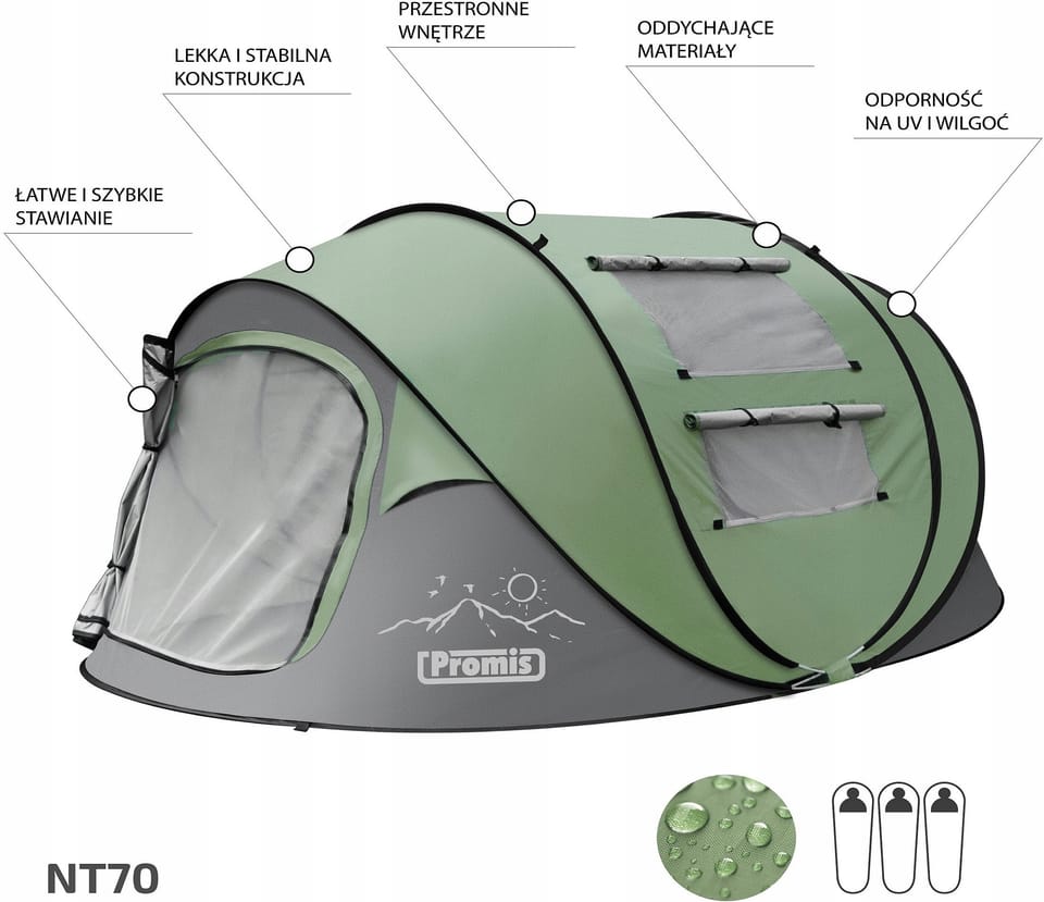 Promis 3 SECONDS to idealne rozwiązanie dla osób poszukujących kompaktowego i łatwego w użyciu schronienia na festiwale, weekendowe wypady za miasto czy pierwsze doświadczenia z kempingiem. Dzięki niewielkim rozmiarom, lekkiej konstrukcji i szybkiemu rozkładaniu, jest doskonałym wyborem dla każdego, kto chce przekonać się, czy biwakowanie to jego styl życia.