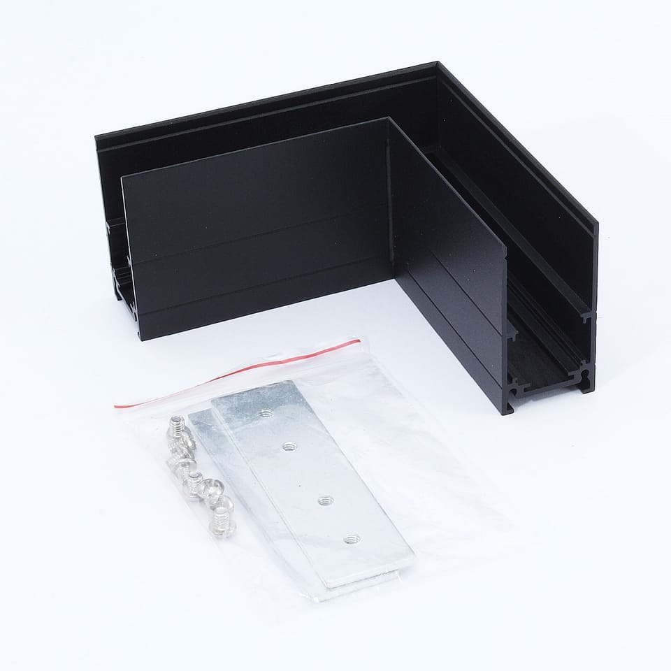 Narożnik natynkowy w czarnym kolorze został wykonany z trwałego i wytrzymałego aluminium. Umożliwia połączenie ze sobą dwóch natynkowych szynoprzeowdów pod kątem prostym.
