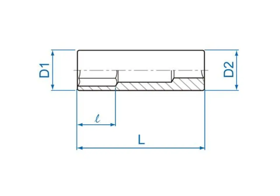 Nasadka długa 1/4", calowa 9/16" x 50 mm, 6-kąt. Wymiary ( mm ) : D1 - 19,6 D2 - 19,6 l - 12 L - 50 Karta produktu - 223518S