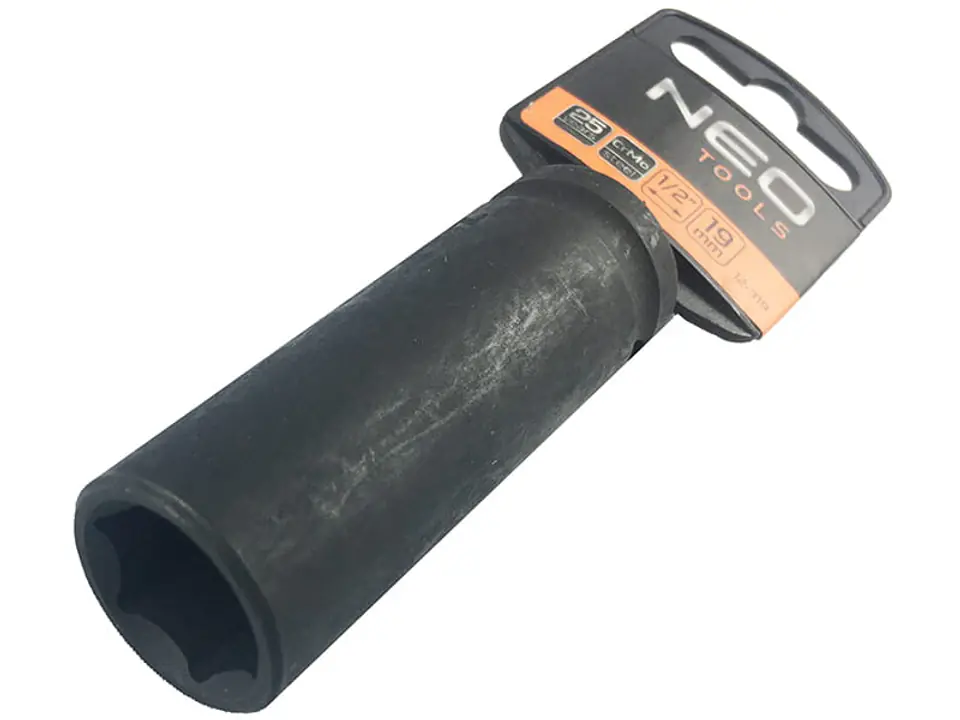 Nasadka udarowa, sześciokątna 19 mm długa, ½ cala NEO 12-319. Wykonana z wytrzymałej stali chromowo-molibdenowej. Pogrubione ścianki nasadki gwarantują jej wysoka wytrzymałość. Większa długość nasadki umożliwia dostęp do głębokich gniazd śrub. Marka NEO spełnia oczekiwania profesjonalistów.