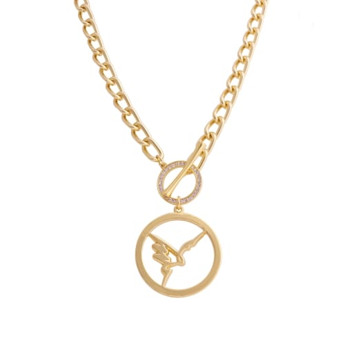 Naszyjnik z łańcucha ankier .Długość 43 cm.Zawieszka o średnicy 4 cm z logo colibra zawieszonana kółku wysadzanym kryształami. Zapięcie typu toggle.
