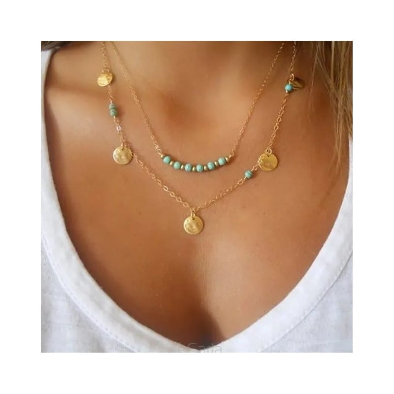 Naszyjnik delikatny podwójny celebrytka z turkusem N164
