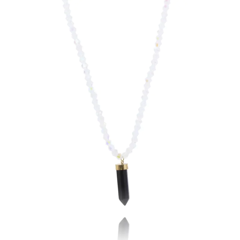 Modny naszyjnik ze stali szlachetnej platerowanej 14 - karatowym złotem z kryształem górskim Świetnie pasuje do eleganckich, jak również do codziennych stylizacji.Elegancki dodatek na każdą okazję, do sukienek, swetrów i bluzek. Kolor:Jasny odcień złotaWymiary:Długość łańcuszka: 46 cm + 5,5 cm Długość kamienia: 3,5 cm Biżuteria ze stali chirurgicznej nie ulega korozji, nie rdzewieje, nie ciemnieje! Producent: Xuping