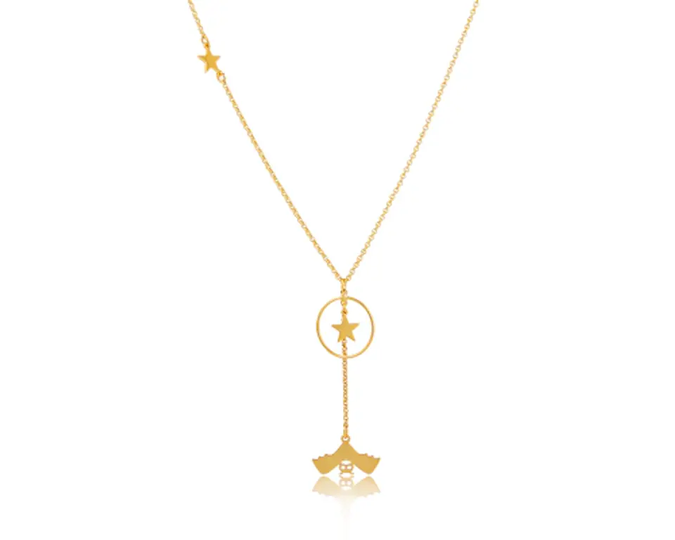 Naszyjnik z motywem nietoperza z dwoma gwiazdkami i kołem. Długość naszyjnika 30cm, przedłużka 6cm, długość zawieszki 5cm.