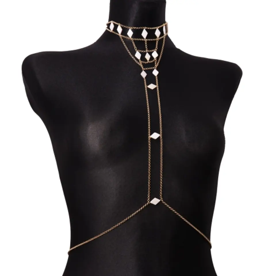 Pozłacany naszyjnik na ciało, ozdobiony masa perłową, zapinany na szyi oraz w pasie. Długość chokera 29,0 cm + 10,0 cm przedłużka, szerokość chokera 2,0 cm, szerokość pojedynczego łańcuszka 0,3 cm. Długość spływającej całości 74,0 cm + 30,0 cm przedłużka w pasie. Waga naszyjnika 51,4 g.