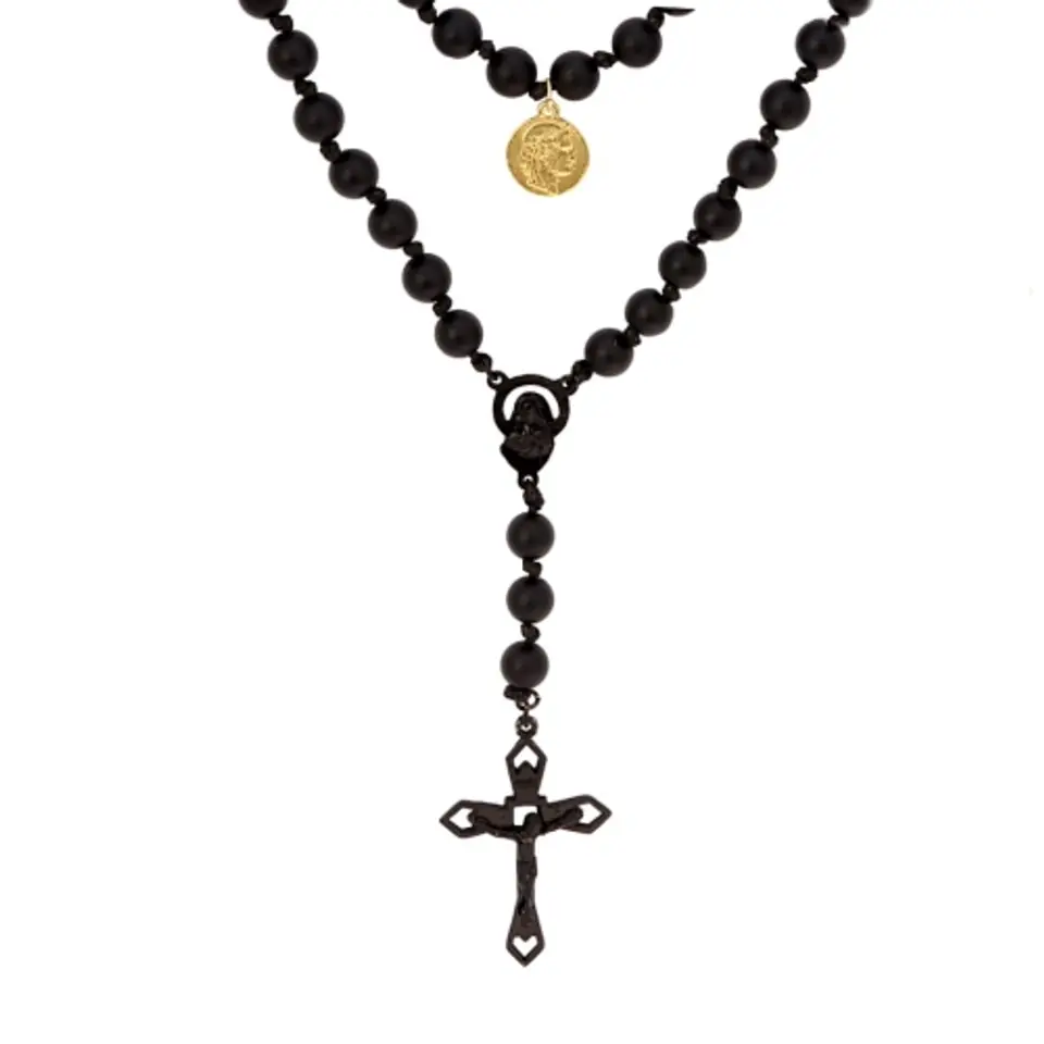 Niezwykły różaniec na szyję wykonany z naturalnych kamieni onyks oraz elementów w kolorze czarnym oraz złotą monetką. Kolekcja Premium dla kobiet. Różaniec można owinąć dwukrotnie wokół szyi. Monetka w kolorze złotym. Długość 110,0 cm, szerokość 0,8 cm. Wymiary krzyża 4,5 cm x 3,0 cm. Waga różańca 82,0 g.