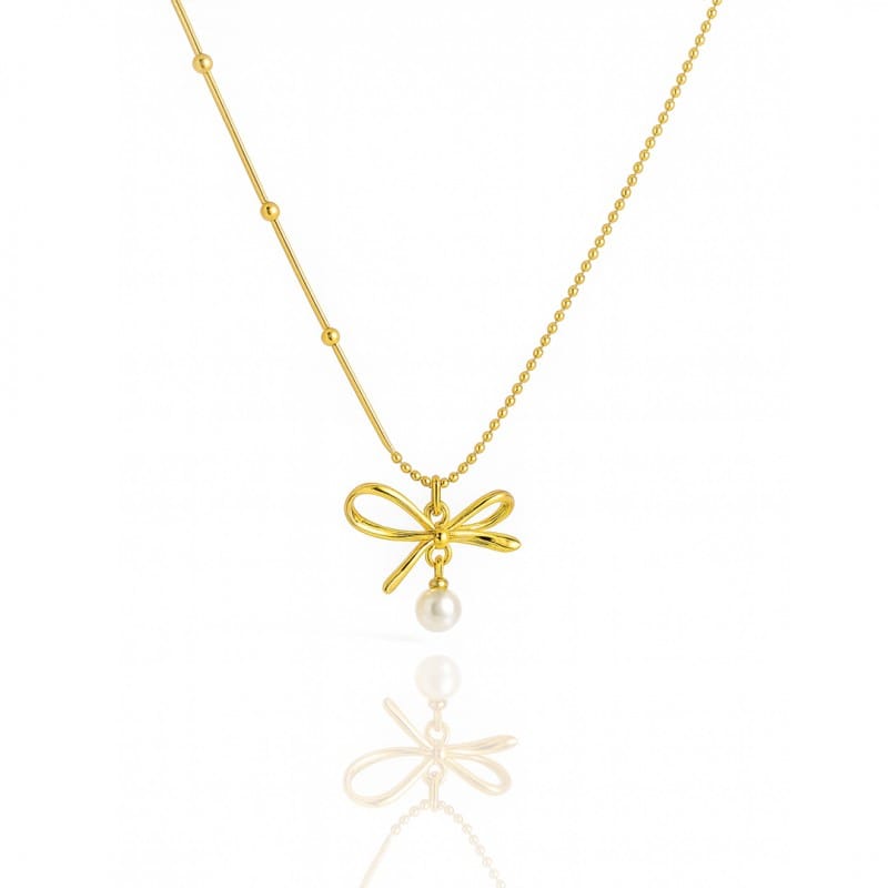 Naszyjnik stal szlachetna pozłacana 14k złotem, Kokardka z Perłą NST2214