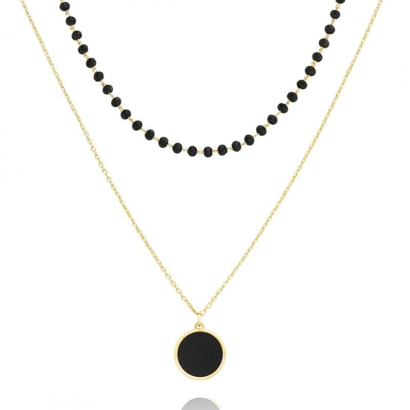 Naszyjnik stal szlachetna pozłacana 14k złotem, podwójny, czarne koraliki, kółko NST2207