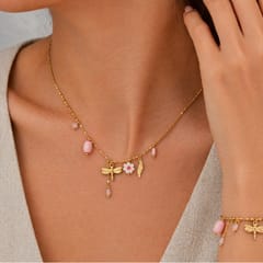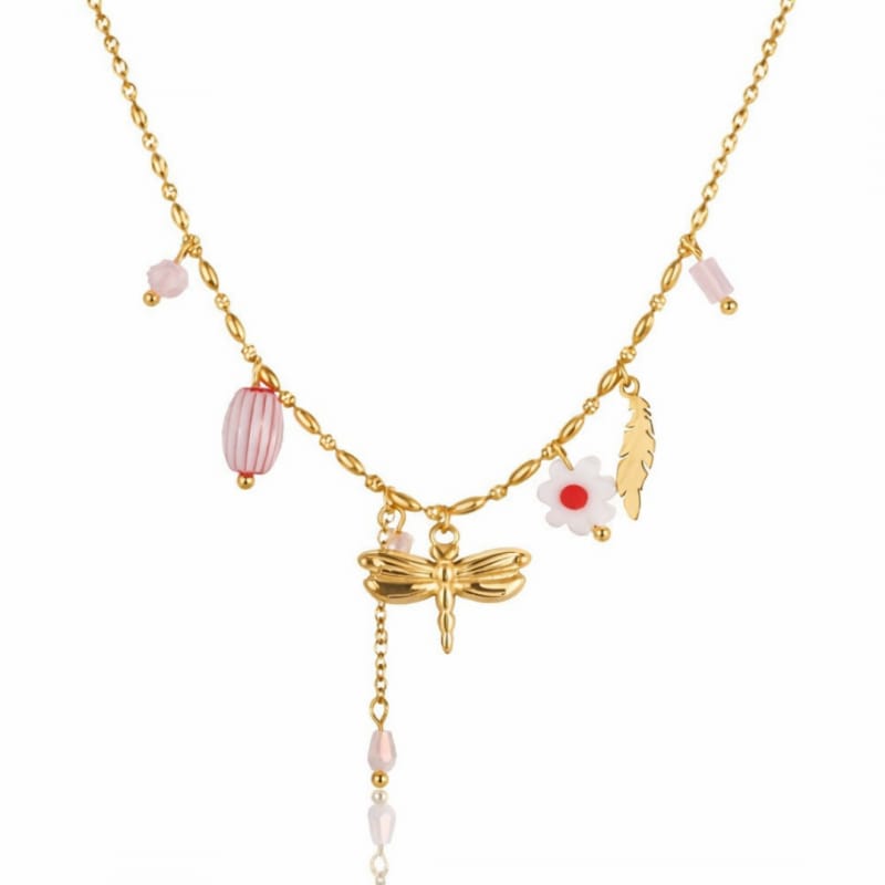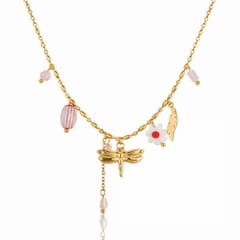 Naszyjnik stal szlachetna pozłacana 14k złotem, Pudrowe Koraliki, Ważka NST2294