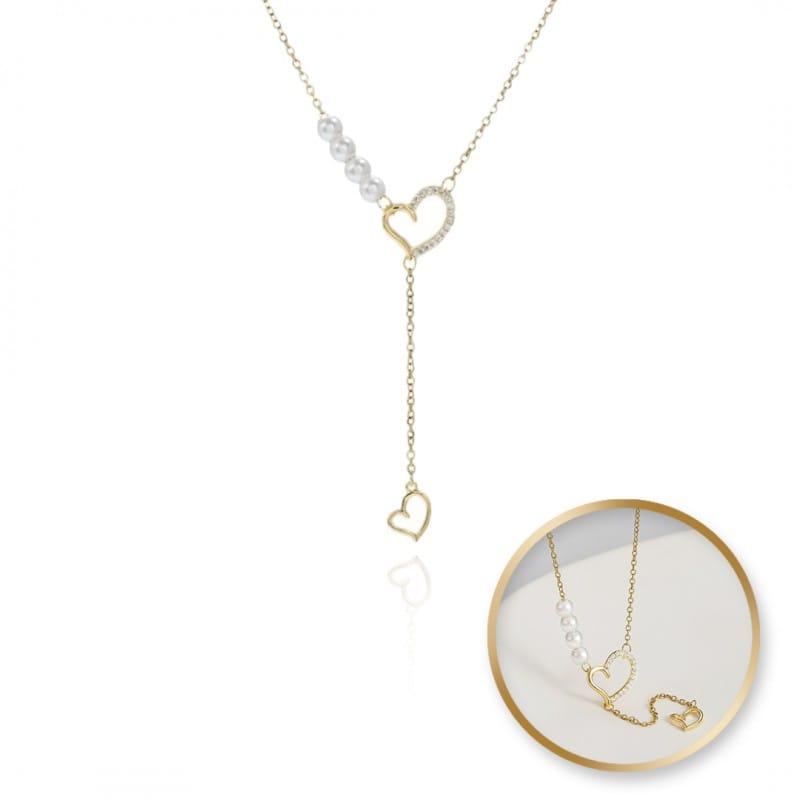 Naszyjnik stal szlachetna pozłacana 14k złotem, SERCA z cyrkoniami, perły NST2172