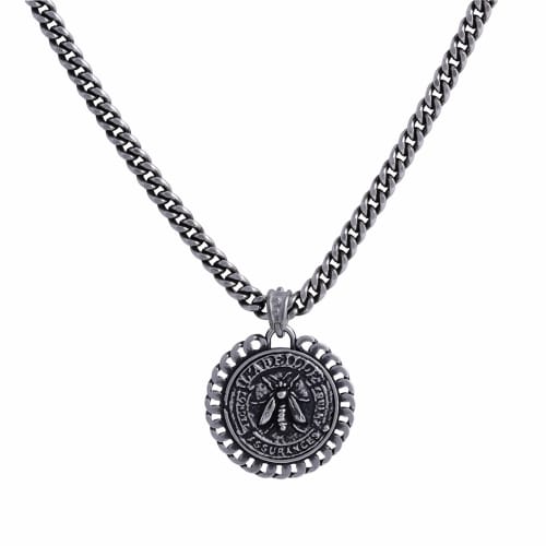 Naszyjnik męski o długości 55 cm. Zawieszka rzeźbiona moneta z pszczołą.