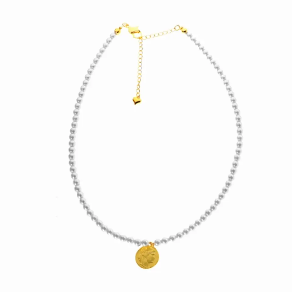 Pozłacany naszyjnik z perełek z wiszącą monetką. Długość naszyjnika wynosi 40cm + przedłużka 9cm.