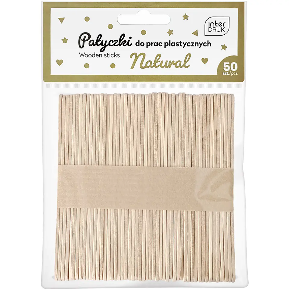 Zestaw 50 sztuk drewnianych patyczków marki Interdruk. Idealne do nauki liczenia, tworzenia tematycznych dekoracji, wszelkich prac DIY, dekoratorskich i modelarskich, scrapbookingu, przyklejania i malowania.