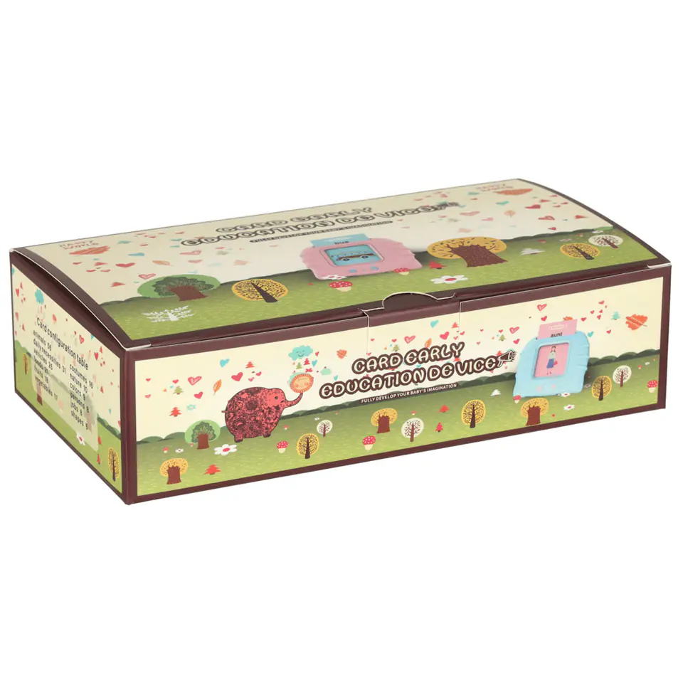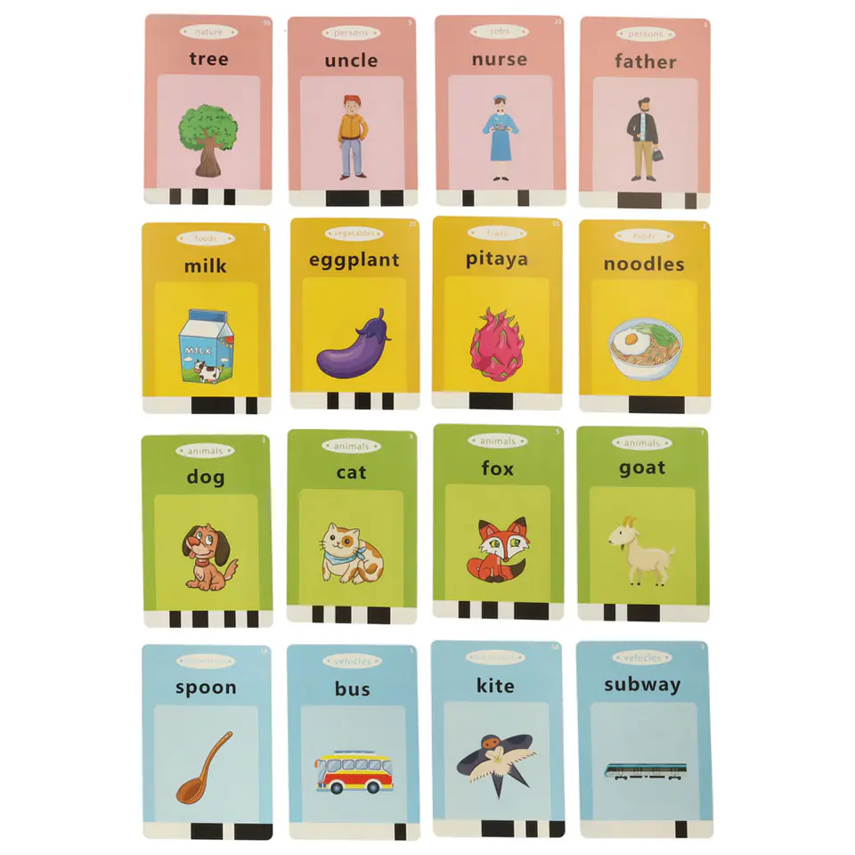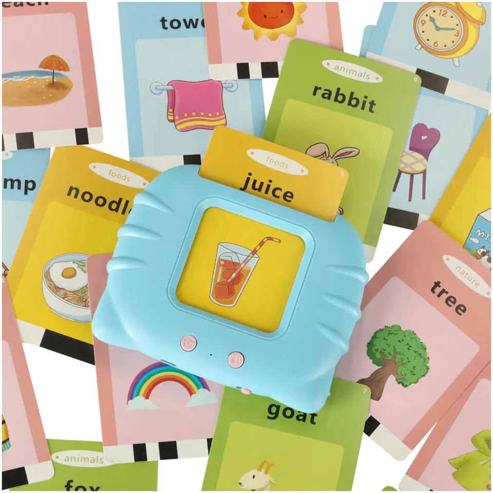 Każda karta posiada dwa wgrane słowa, po jednym na każdą stronę, oraz odpowiedni rysunek, który pozwala zrozumieć ich znaczenie. Stymuluje to zarówno wzrok i słuch dziecka, dzięki czemu z pewnością dopasuje się do najefektywniejszego sposobu uczenia się każdego malucha.