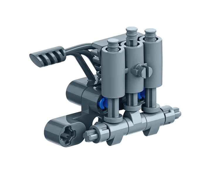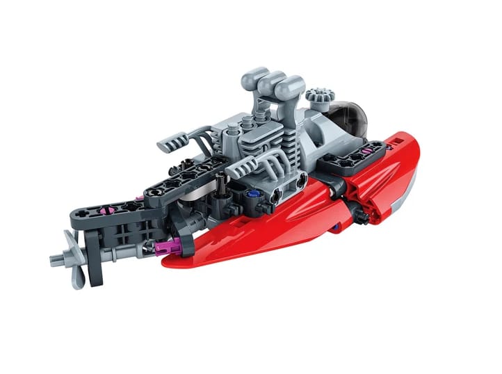 ✔ montaż wyścigowej motorówki z ruchomymi tłokami i działającym zaczepem✔ zastosowanie kół zębatych połączonych ze śrubą za pomocą przegubu cardana✔ poznanie mechanizmów przenoszenia ruchu i realistycznego działania silnika