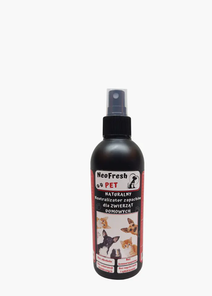 NeoFresh PET to profesjonalny produkt do usuwania uporczywych zapachów pochodzenia odzwierzęcego.Neutralizator NeoFresh PET likwiduje źródło powstania brzydkiego zapachu, a nie tylko go maskuje.Nadaje się do stosowania na każdej powierzchni i materiale, usuwa uporczywe zapachy z mebli, podłóg, ścian, dywanów oraz wszelkich tkanin, nie odbarwiając ich. Preparat bardzo szybko zneutralizuje brzydkie zapachy po odchodach, w miejscach przebywania zwierząt, a także z różnych ich akcesoriów, np. klatek, kuwet, misek, legowisk, zabawek, smyczy, itp.NeoFresh PET jest bezpieczny w przypadku kontaktu ze skórą, łapami, sierścią i włosami zwierzęcia.NeoFresh PET to w 100% naturalny i bezpieczny neutralizator na bazie tylko dwóch składników: wody i kwasu podchlorawego. Nie zawiera żadnych substancji zapachowych i konserwujących.SPOSÓB UŻYCIA:Dokładnie oczyścić zabrudzone miejsce usuwając z niego źródło nieprzyjemnego zapachu. Następnie spryskać daną powierzchnię preparatem NeoFresh PET i pozostawić do wyschnięcia. Czynność powtarzać 2-3 razy dziennie. W razie potrzeby stosować preparat przez kilka kolejnych dni, aż do całkowitego usunięcia uporczywego zapachu. Po użyciu preparatu pozostanie tylko czysta woda, która wyschnie, nie pozostawiając śladów. W razie potrzeby przetrzeć suchą ścierką lub papierem. Można stosować bezpośrednio na zwierzę, unikając kontaktu z oczami. Do użytku wewnątrz i na zewnątrz pomieszczeń.ŚRODKI OSTROŻNOŚCI:Bezpieczny w przypadku połknięcia niewielkich ilości. W przypadku kontaktu z oczami ostrożnie przemyć wodą. W razie potrzeby skonsultować się z lekarzem. Przechowywać w temperaturze do 25°C. Nie wystawiać na działanie promieni słonecznych. Nie mieszać z innymi substancjami. Nie przelewać do innego opakowania.SKŁAD/Ingredients (INCI): woda (aqua), kwas podchlorawy (hypochlorous acid).