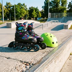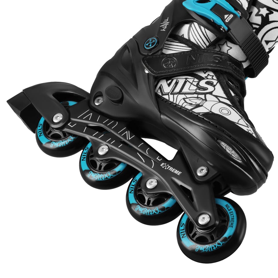 NH10907 TINTY NILS EXTREME to regulowane łyżworolki dla dzieci, które chcą rozpocząć naukę jazdy w kreatywny i angażujący sposób. Model wyróżnia się funkcją 4w1, dzięki której jeden zestaw można skonfigurować jako łyżwy, łyżworolki, wrotki lub rolko-wrotki. To praktyczne rozwiązanie, które pozwala dopasować sprzęt do etapu nauki oraz preferowanej formy aktywności. TINTY to nie tylko funkcjonalność, ale także zabawa i możliwość wyrażenia siebie. W zestawie znajduje się 7 permanentnych markerów, którymi dziecko może samodzielnie pokolorować wzór na bucie i nadać mu indywidualny charakter. Dzięki temu każda para może wyglądać inaczej, a sama nauka jazdy staje się jeszcze ciekawsza. Model został wyposażony w wygodny, oddychający but oraz wielopunktowy system zapięcia: klamrę, sznurowadła i pasek na rzep, co zapewnia stabilne trzymanie stopy i lepszą kontrolę podczas jazdy. Dodatkowo regulacja rozmiaru za pomocą jednego przycisku pozwala łatwo dopasować but do rosnącej stopy dziecka i korzystać z jednego zestawu przez dłuższy czas. Za płynną jazdę odpowiada aluminiowa płoza, łożyska ABEC-7 oraz koła PU o twardości 82A. Rozmiar kół został dopasowany do rozmiaru buta, co wspiera stabilność i komfort jazdy. Dodatkowym atutem jest tylny hamulec w prawej rolce, który zwiększa bezpieczeństwo podczas nauki i rekreacyjnej jazdy. Specyfikacja: Konfiguracja 4w1: łyżwy / łyżworolki / wrotki / rolko-wrotki Płoza (łyżworolki): aluminium Łożyska: ABEC-7 Koła: PU Twardość kół: 82A Rozmiar kół: 70 × 22 mm Rozmiar buta (regulowany): 35–38 Długość wkładki: 21,5–23,9 cm Zapięcie: klamra + sznurowadła + pasek na rzep Hamulec: tylny, w prawej rolce Maks. waga użytkownika: 20–80 kg W zestawie: markery permanentne (7 kolorów) Uwagi: Nie przeznaczone do użytku komercyjnegoPomalowana powierzchnia wymaga czasu na wyschnięcie i utrwalenie koloru. Zgodne z normą PN-EN 13843:2009 Gwarancja 24 miesiące Importer: Abisal Sp. z o.o.| Polska | 41-807 Zabrze | ul. Pyskowicka 17 | e-mail: abisal@abisal.plAbisal Sp. z o.o. deklaruje, iż produkty sprzedawane przez firmę są bezpieczne i spełniają wymagania zawarte w Ustawie o ogólnym bezpieczeństwie produktów z dnia 12 grudnia 2003r. (Dz.U. z dnia 31 grudnia 2003r.)