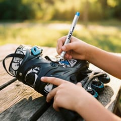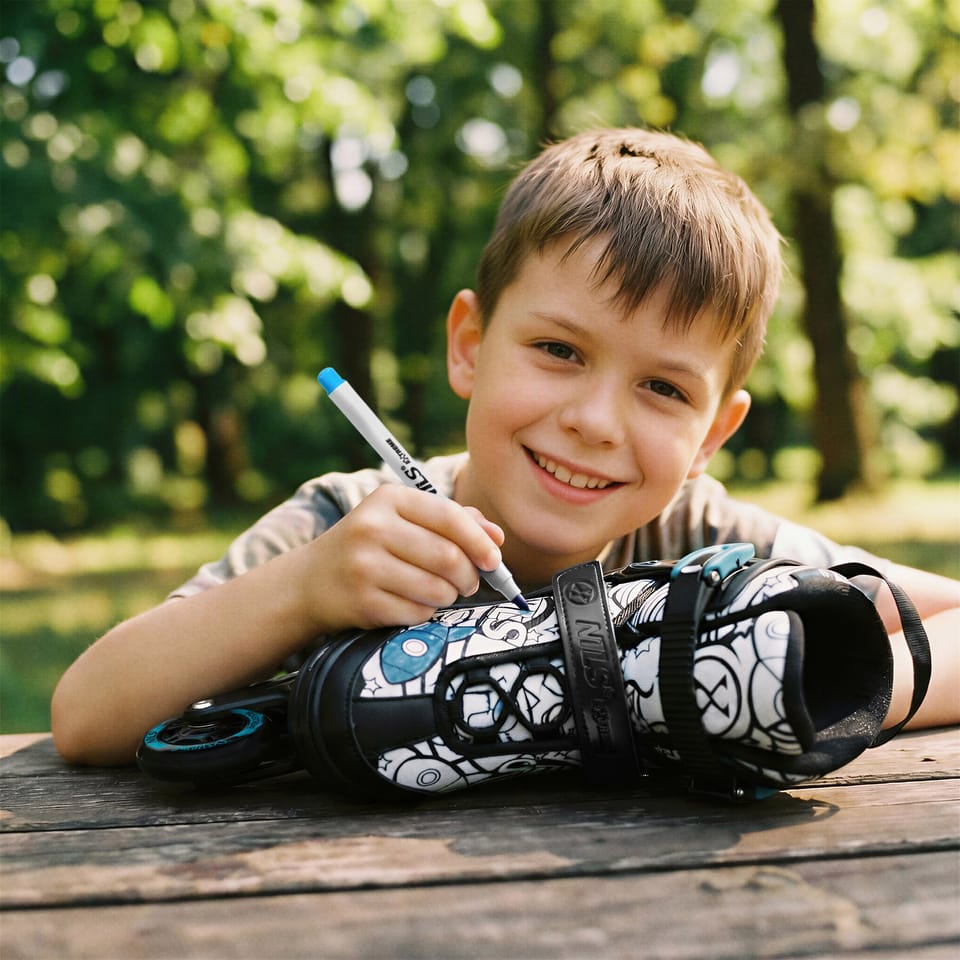 NH10907 TINTY NILS EXTREME to regulowane łyżworolki dla dzieci, które chcą rozpocząć naukę jazdy w kreatywny i angażujący sposób. Model wyróżnia się funkcją 4w1, dzięki której jeden zestaw można skonfigurować jako łyżwy, łyżworolki, wrotki lub rolko-wrotki. To praktyczne rozwiązanie, które pozwala dopasować sprzęt do etapu nauki oraz preferowanej formy aktywności. TINTY to nie tylko funkcjonalność, ale także zabawa i możliwość wyrażenia siebie. W zestawie znajduje się 7 permanentnych markerów, którymi dziecko może samodzielnie pokolorować wzór na bucie i nadać mu indywidualny charakter. Dzięki temu każda para może wyglądać inaczej, a sama nauka jazdy staje się jeszcze ciekawsza. Model został wyposażony w wygodny, oddychający but oraz wielopunktowy system zapięcia: klamrę, sznurowadła i pasek na rzep, co zapewnia stabilne trzymanie stopy i lepszą kontrolę podczas jazdy. Dodatkowo regulacja rozmiaru za pomocą jednego przycisku pozwala łatwo dopasować but do rosnącej stopy dziecka i korzystać z jednego zestawu przez dłuższy czas. Za płynną jazdę odpowiada aluminiowa płoza, łożyska ABEC-7 oraz koła PU o twardości 82A. Rozmiar kół został dopasowany do rozmiaru buta, co wspiera stabilność i komfort jazdy. Dodatkowym atutem jest tylny hamulec w prawej rolce, który zwiększa bezpieczeństwo podczas nauki i rekreacyjnej jazdy. Specyfikacja: Konfiguracja 4w1: łyżwy / łyżworolki / wrotki / rolko-wrotki Płoza (łyżworolki): aluminium Łożyska: ABEC-7 Koła: PU Twardość kół: 82A Rozmiar kół: 64 × 22 mm Rozmiar buta (regulowany): 31–34 Długość wkładki: 19–21,4 cm Zapięcie: klamra + sznurowadła + pasek na rzep Hamulec: tylny, w prawej rolce Maks. waga użytkownika: 20–50 kg W zestawie: markery permanentne (7 kolorów) Uwagi: Nie przeznaczone do użytku komercyjnegoPomalowana powierzchnia wymaga czasu na wyschnięcie i utrwalenie koloru. Zgodne z normą PN-EN 13843:2009 Gwarancja 24 miesiące Importer: Abisal Sp. z o.o.| Polska | 41-807 Zabrze | ul. Pyskowicka 17 | e-mail: abisal@abisal.plAbisal Sp. z o.o. deklaruje, iż produkty sprzedawane przez firmę są bezpieczne i spełniają wymagania zawarte w Ustawie o ogólnym bezpieczeństwie produktów z dnia 12 grudnia 2003r. (Dz.U. z dnia 31 grudnia 2003r.)