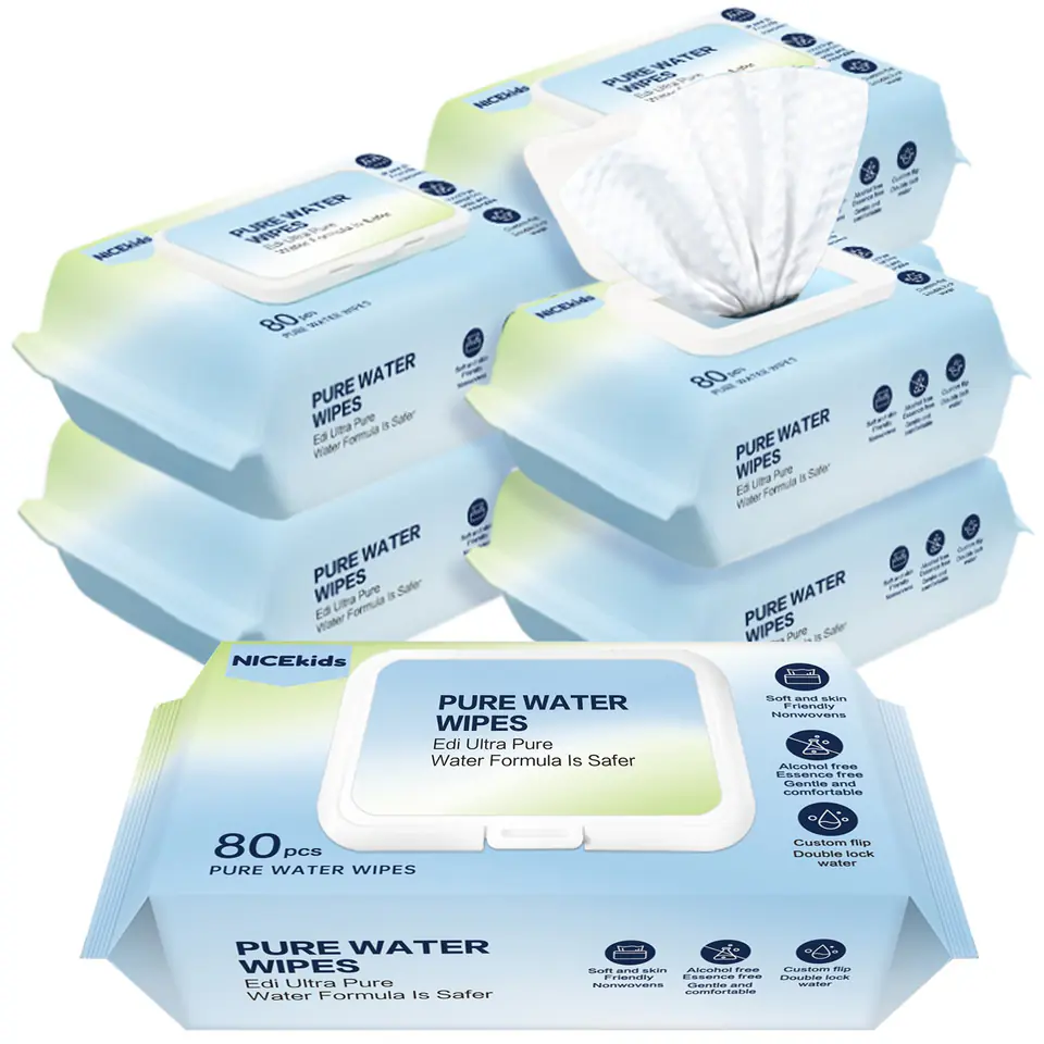 Nawilżane chusteczki NICEKIDS Pure Water to doskonały wybór dla troskliwych rodziców. Wyprodukowane z 99,9% czystej wody, są delikatne dla skóry Twojego maluszka.