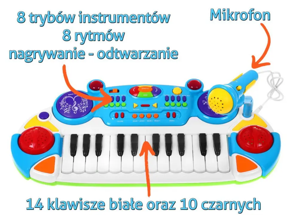 KEYBOARD POSIADA: - klawiaturę muzyczną z gamą, - głośnik, - migający zestaw światełek, - regulację głośności, - zwalnianie i przyspieszanie rytmu, - generator rytmów oraz akordów, - system akompaniamentu, - 8 rodzajów rytów muzycznych disco, samba, blues..., - 4 rodzaje werbli, - dodatkowo 8 rodzajów instrumentów takich jak: gitara, wiolonczela, pianino..., - nagrywanie i odtwarzanie dźwięków (przycisk RECORD oraz przycisk PLAY), - karaoke (mikrofon). | |