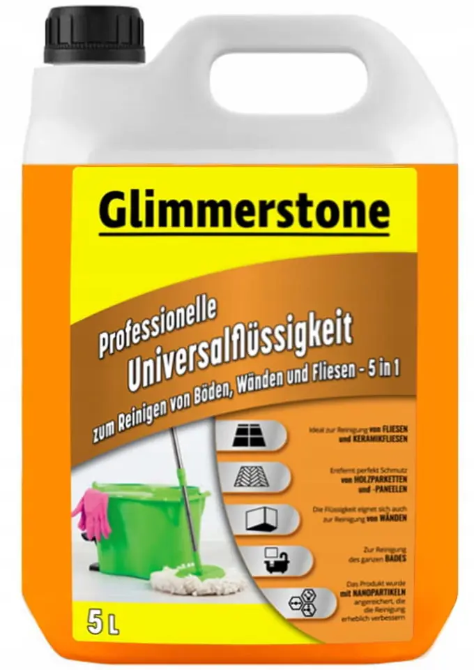 Niemiecki, profesjonalny płyn do mycia wszystkich rodzajów podłóg, w kanistrze o pojemności 5 litrów. Usuwa wyjątkowo uporczywe zabrudzenia. Glimmerstone - Produkt najwyższej jakości produkcji niemieckiej.