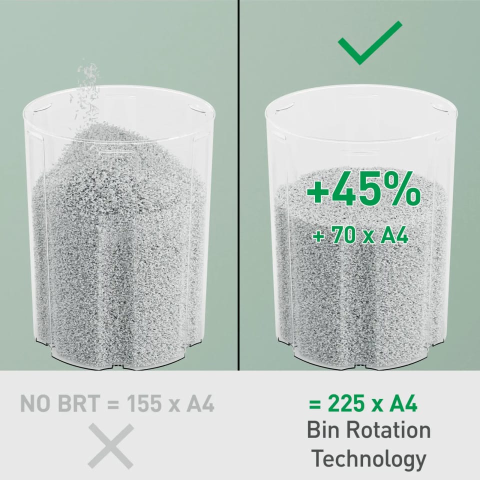 - Duży, 15-litrowy pojemnik na ścinki zmieści do 225 pociętych kartek A4, zanim wymagać będzie opróżnienia; większa o +45% pojemność (+70 kartek A4) w porównaniu do niszczarek bez technologii BRT.