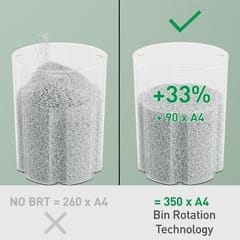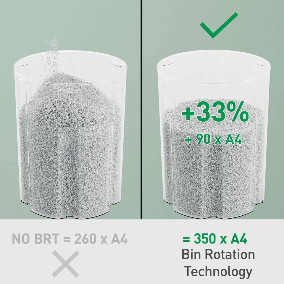 - Duży, 22-litrowy pojemnik na ścinki zmieści do 350 pociętych kartek A4 zanim wymagać będzie opróżnienia; większa o +33% pojemność (dodatkowe 90 kartek A4) w porównaniu do niszczarek bez technologii BRT.