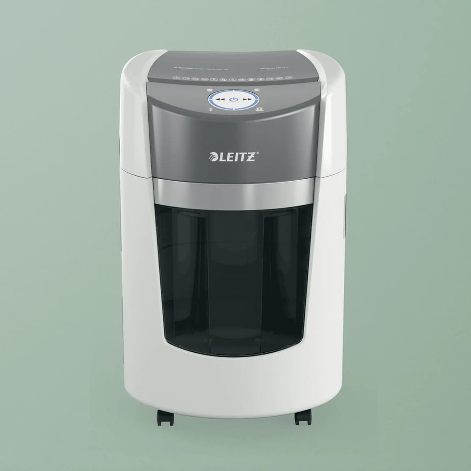 Leitz IQ OptiMax Small Office to innowacyjna i stylowa niszczarka, która zapewnia wysoki poziom bezpieczeństwa niszczonych dokumentów oraz daje pewność, że cały proces przebiegnie bezproblemowo. Oferuje wysoki poziom bezpieczeństwa DIN P5, tnąc na mikrościnki do 8 kartek A4 jednocześnie - jest idealną niewielką niszczarką do użytku osobistego i biurowego. Wyposażona jest w unikalną technologię obrotowego pojemnika (Bin Rotation Technology - BRT), która zwiększa jego pojemność o 33%.*Obrotowy pojemnik na ścinki zapewnia równomierne rozprowadzanie ścinków, zapobiegając tworzeniu się piramidy, co pozwala zmieścić w nim dodatkowych 90 kartek A4, zanim będzie wymagał opróżnienia. Technologia obrotowego pojemnika eliminuje konieczność wyciągania lub potrząsania pojemnikiem; wskaźnik „pojemnik pełny” aktywuje się tylko wtedy, gdy pojemnik osiągnie 100% wypełnienia. Dzięki dużemu, 22-litrowemu pojemnikowi na ścinki, który pomieści do 350 pociętych kartek A4, zapewnia mniej przerw w pracy. Podświetlany na niebiesko pojemnik na ścinki i intuicyjny obrotowy wyświetlacz LED wyświetlają klarowne, łatwe do zrozumienia komunikaty ostrzegawcze, np. o zapełnienia pojemnika czy otwartych drzwiczkach, dzięki którym proces niszczenia jest prosty i wydajny.