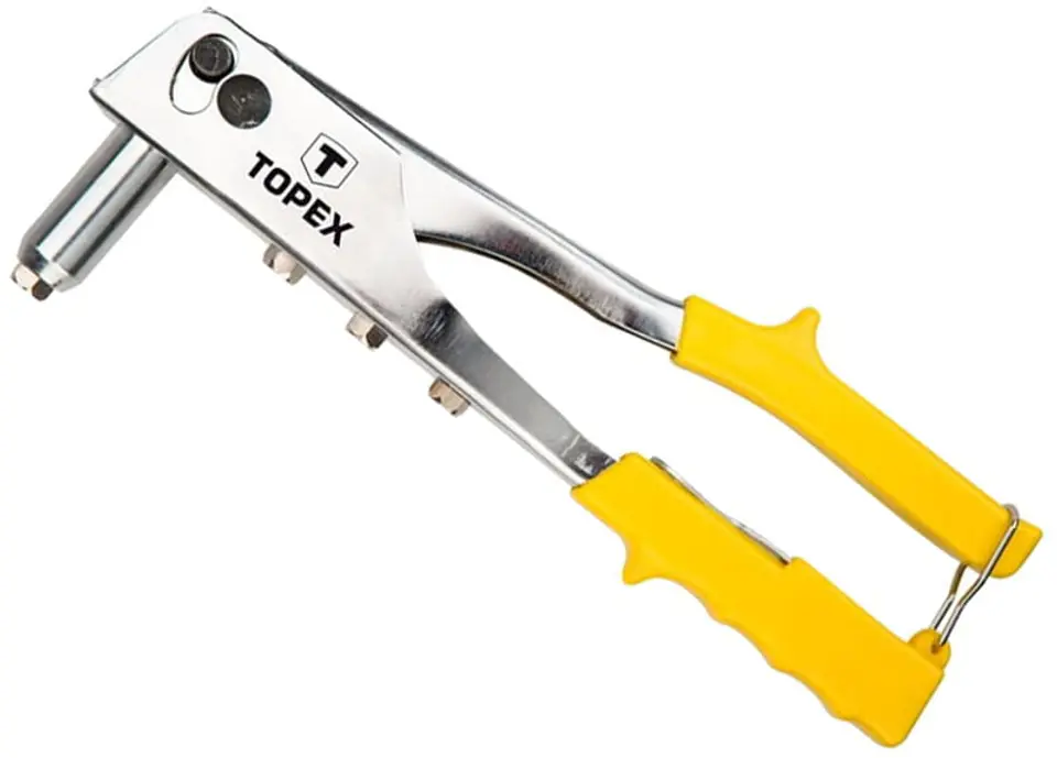Nitownica TOPEX do nitów aluminiowych o średnicy 2.4, 3.2, 4.0, 4.8 mm. Solidna stalowa rękojeść górna i korpus nitownicy. Wydłużony przód głowicy ułatwia nitowanie w miejscach trudno dostępnych. Wygodne uchwyty, z pierścieniem blokującym ułatwiającym przechowywanie.