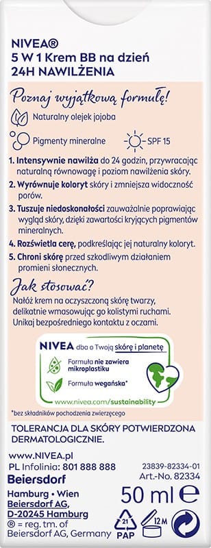 NIVEA Krem BB 5w1 na dzień zawiera szybko wchłaniającą się formułę z naturalnym Olejkiem Jojoba i mineralnymi pigmentami, które intensywnie nawilżają skórę do 24 godzin. To koloryzujący krem ??na dzień do jasnej karnacji, który zakrywa niedoskonałości, takie jak wypryski, oznaki zmęczenia, cienie pod oczami, przebarwienia, zaczerwienienia i drobne zmarszczki. Wyrównuje koloryt skóry i zmniejsza widoczność porów. SPF 15 zapewnia ochronę przed niekorzystnym działaniem promieni słonecznych. Rozświetla cerę, podkreślając jej naturalny koloryt! Nadaje się do każdego typu skóry. Zgodność kremu BB ze skórą została potwierdzona dermatologicznie.
