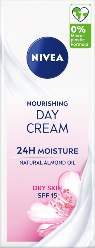 NIVEA Odżywczy Krem na dzień 24H NAWILŻENIA odpowiedni dla cery suchej i wrażliwej posiada wyjątkową formułę zawierającą NIVEA Moisture Care Complex, Naturalny olejek migdałowy oraz filtr SPF 15.
