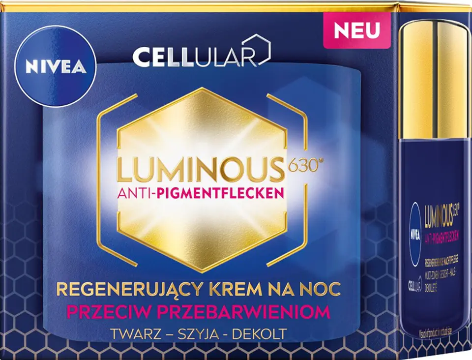 Odkryj NIVEA CELLULAR LUMINOUS630 Regenerujący krem na noc przeciw przebarwieniom, który zapewnia nocną regenerację skóry dzięki opatentowanemu składnikowi LUMINOUS630. Krem rozjaśnia istniejące przebarwienia i zmniejsza ich powierzchnię. Każdej nocy regeneruje i wzmacnia skórę dzięki formule z aktywującym komórki skóry* kwasem hialuronowym. Przy regularnym stosowaniu widocznie rozjaśnia przebarwienia i zmniejsza ich powierzchnię dzięki LUMINOUS630®. Rezultat widoczny jest już po 4 tygodniach. Produkt jest delikatny dla skóry i odpowiedni dla każdej karnacji oraz typu skóry, także wrażliwej. Może być stosowany przez kobiety w ciąży. Tolerancja dla skóry potwierdzona dermatologicznie.