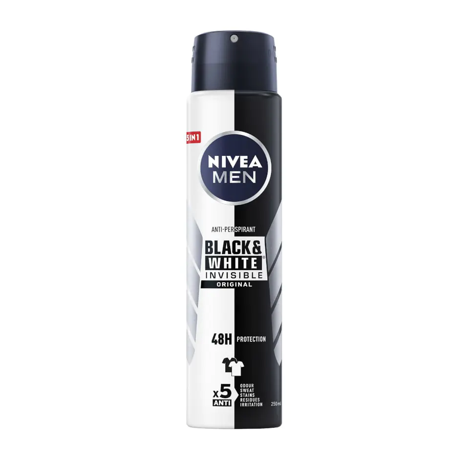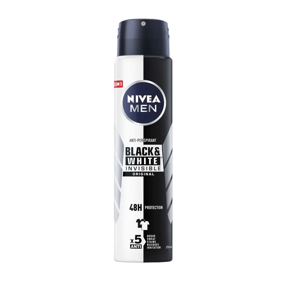 NIVEA Men Antyperspirant INVISIBLE Power w sprayu for Black&White to antyperspirant opracowany we współpracy z ekspertami z dziedziny tekstyliów, by zapewnić Ci mocną i niezawodną ochronę przed poceniem się, bez ryzyka pobrudzenia ubrań. Spray nie pozostawia białych plam na czarnych ubraniach ani żółtych na białych. Czarne bluzki pozostają czarne, a białe – białe, bez przebarwień i smug. Unikalna formuła chroni Cię przed nadmiernym poceniem się przez 48 godzin i pomaga zachować pierwotny kolor ubrań. Przezroczysta ochrona nie pozostawia śladów – cokolwiek na siebie założysz. Antyperspirant opracowany we współpracy z Międzynarodowym Instytutem Tekstylnym Hohenstein.