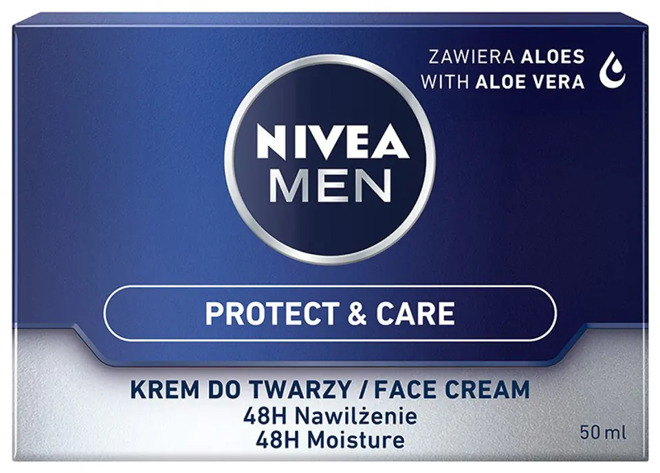NIVEA MEN PROTECT & CARE 48H NAWILŻAJĄCY KREM DO TWARZY Nawilżająca formuła z aloesem i prowitaminą B5 pielęgnuje skórę i chroni ją przed czynnikami zewnętrznymi powodującymi wysuszenie. Natychmiastowo nawilża skórę twarzy oraz wzmacnia jej naturalną barierę ochronną. Dodatkowo łagodzi i regeneruje skórę po goleniu. Ma nietłustą konsystencję i szybko się wchłania. Co więcej chroni skórę przed niekorzystnym wpływem czynników zewnętrznych i działaniem promieni słonecznych. Dla najlepszych rezultatów przygotuj skórę poprzez umycie jej żelem do mycia twarzy NIVEA MEN. TOLERANCJA DLA SKÓRY POTWIERDZONA DERMATOLOGICZNIE NIVEA MEN - Zacznij działać!