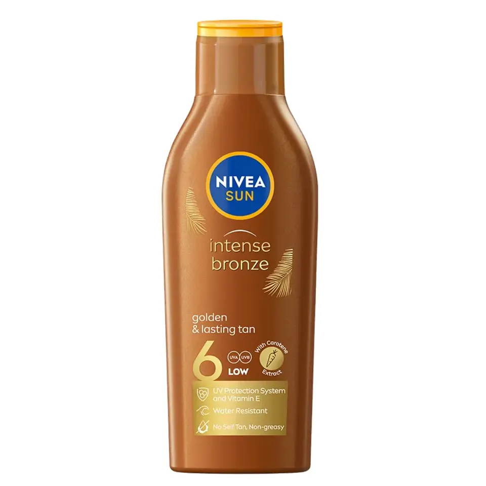 Nivea Intense Bronze karotenowy balsam do opalania SPF6 200ml (P1)4005808445981NIVEA Karotenowy balsam do ciała SPF 6 Pielęgnacja: Balsam pomaga zapewnić złocistą, intensywną i długotrwałą opaleniznę. Posiada formułę z witaminą E i ekstraktem karotenowym, które zapewniają uczucie gładkiej i jedwabistej skóry. Dodatkowo chronią przed oparzeniami słonecznymi oraz przedwczesnym starzeniem się skóry. Ochrona: Produkt zawiera wysoce skuteczny system filtrów UVA/UVB, który zapewnia natychmiastową i skuteczną ochronę przed promieniowaniem. Dodatkowo skutecznie chroni przed poparzeniem oraz długotrwałym uszkodzeniem skóry na skutek promieniowania słonecznego. Jest wodoodporny. Zaufaj jakości NIVEA Sun.