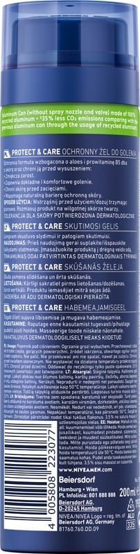Zastosowanie: Ochronny żel do golenia PROTECT & CARE pomaga przeciwdziałać wysuszeniu i napięciu skóry, chroniąc ją jednocześnie przed mikrozacięciami i podrażnieniami.