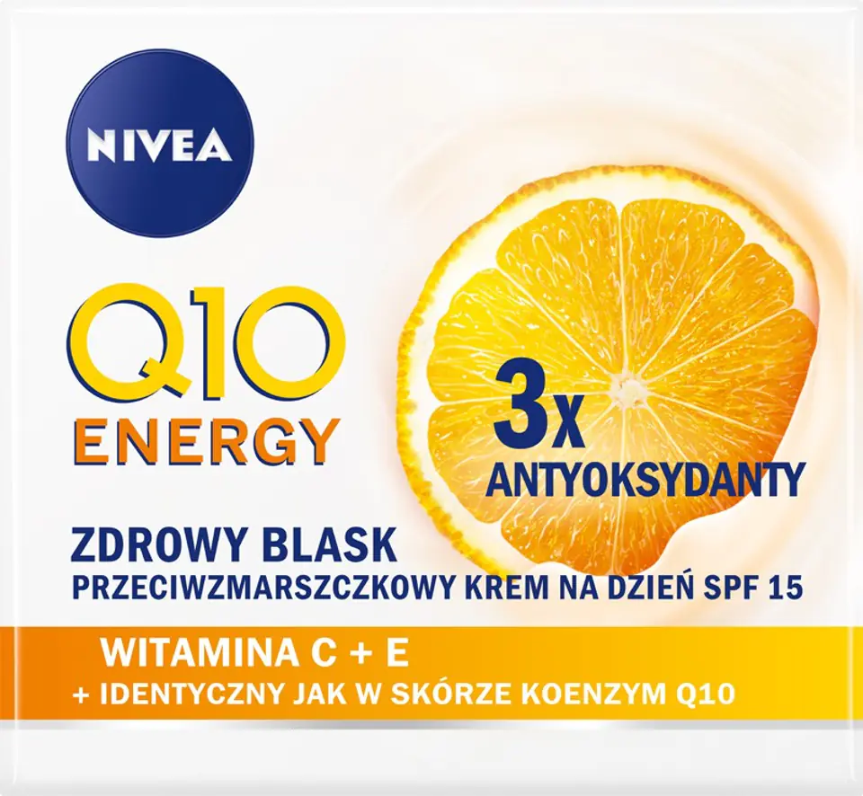 Krem przeciwzmarszczkowy NIVEA Q10 ENERGY ZDROWY BLASK zapewnia Twojej skórze 24 godziny nawilżenia i blasku by Twoja skóra była bardziej promienna i rozświetlona. Wyjątkowa formuła łącząca moc aż 3 antyoksydantów: Witaminy C, Witaminy E i koenzymu Q10 identycznego jak w skórze, redukuje zmarszczki w ciągu dwóch tygodni i jednocześnie ujędrnia skórę. Niweluje oznaki zmęczenia widoczne na skórze, by Twoja skóra była pełna świeżości. Zawarte w kremie filtry UVA / UVB z SPF 15 zapewniają ochronę przed promieniowaniem słonecznym, zapobiegając powstawaniu zmarszczek. Ciesz się natychmiastowym odświeżeniem i gładkością skóry z energetyzującą pielęgnacją NIVEA Q10 ENERGY o zapachu pomarańczy.