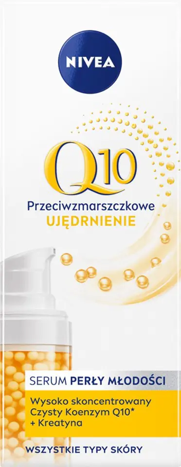 NIVEA(R) Q10 POWER Skoncentrowane Perły Młodości -serum przeciwzmarszczkowe zawiera IDENTYCZNY jak ten występujący w Twojej skórze Koenzym Q10. Otrzymany w procesie fermentacji drożdży, ten czysty i naturalnej jakości Koenzym Q10 działa w idealnej harmonii z Twoją skórą.W 100% identyczny jak w skórze Koenzym Q10 to naturalna ochrona przed procesem starzenia się skóry i skuteczny antyoksydant.Keratyna to organixczny kwas,który wzmacnia włókna ujędrniające skórę