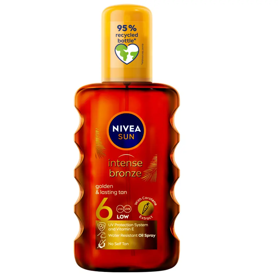 Nivea Sun olejek karotenowy do opalania w spray'u SPF6 200ml (P1)5900017049564NIVEA Sun Karotenowy olejek do opalania w sprayu SPF 6 Pielęgnacja: Olejek pomaga zapewnić złocistą, intensywną i długotrwałą opaleniznę. Posiada formułę z witaminą E i olejkiem jojoba, które zapewniają uczucie gładkiej i jedwabistej skóry. Dodatkowo chroni przed oparzeniami słonecznymi oraz przedwczesnym starzeniem się skóry. Ochrona: Produkt zawiera wysoce skuteczny system filtrów UVA/UVB, który zapewnia natychmiastową i skuteczną ochronę przed promieniowaniem. Dodatkowo skutecznie chroni przed długotrwałym uszkodzeniem skóry na skutek promieniowania słonecznego. Jest wodoodporny. Zaufaj jakości NIVEA Sun.