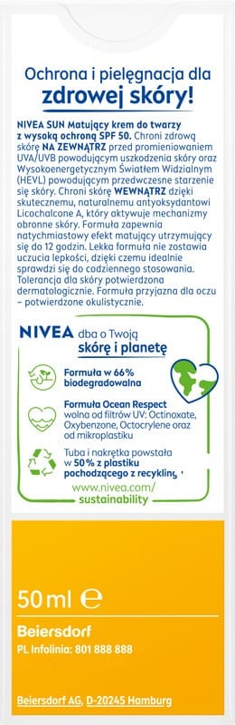 Matujący krem do twarzy z filtrem SPF 50 NIVEA SUN UV Face Shine Control to pielęgnująca formuła, zapewniająca wysoką ochronę i długotrwały efekt matujący. Lekka formuła szybko się wchłania, nie pozostawiając lepkiego uczucia na skórze i natychmiastowo chroni skórę i redukuje nadmiar sebum.