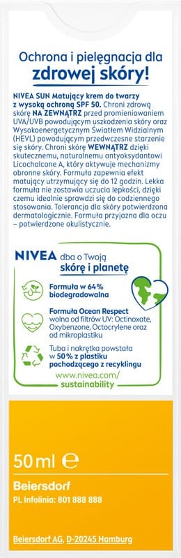 Matujący krem koloryzujący do twarzy z wysoką ochroną przeciwsłoneczną SPF 50 Light Tinted NIVEA SUN. Chroni zdrową skórę NA ZEWNĄTRZ przed promieniowaniem UVA/UVB powodującym uszkodzenia skóry oraz Wysokoenergetycznym Światłem Widzialnym (HEVL) powodującym przedwczesne starzenie się skóry. Dzięki skutecznemu działaniu naturalnego antyoksydantu Licochalcone A zawartego w formule, który aktywuje mechanizmy obronne skóry i chroni ją od WEWNĄTRZ.