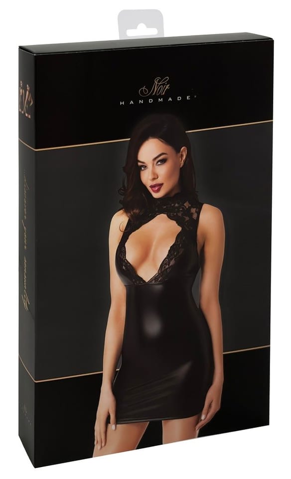 Powerwet look z koronkową górą!Obcisła mini sukienka bez rękawów marki Noir w eleganckim czarnym kolorze z delikatną koronką na miseczkach i szerokimi ramiączkami. Miękka i elastyczna dla ścisłego dopasowania i wysokiego komfortu noszenia. Duże koronkowe wycięcie z przodu dekoltu. Duże wycięcie w górnej części pleców. Koronkowy półgorset z zapięciem na guziki.76% poliester, 24% elastan, powłoka polimerowa.